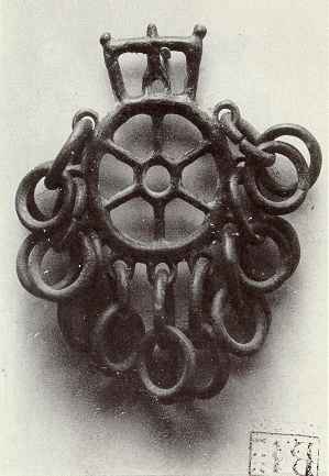 Ad una defunta si può forse riferire il più grande degli ossuari, alto cm 76 (fig. 6), che racchiudeva assieme alle ossa combuste un corredo composto esclusivamente da oggetti di ornamento: una collana di almeno sei perle in vetro policromo, due fibule in bronzo ed un pendaglio in forma di ruota, pure in bronzo, arricchito da una cascata di anellini disposti a grappoli lungo la sua circonferenza (fig. 7).
