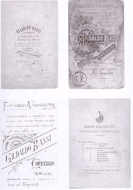 "Gildaldo Bassi fotografo in Correggio tornato dall'America" scriveva sul retro delle "carte de visite", pubblicizzando il suo atelier. Sono questi gli anni in cui grande è lo sforzo dell'artista di avviare l'attività, giungendo subito a concreti risultati; non bisogna altresì dimenticare l'impegno politico, questo tumultuoso giovane obbligato dalla polizia ad un'emigrazione forzata non ha rinunciato alla sua "battaglia", diventata ora meno radicale, ma ugualmente ricca di episodi. L'esordio in fotografia è da itinerante, una figura che si era andata diffondendo tra gli anni '50 e '60 soprattutto nel Nord Italia grazie a diversi dagherrotipisti molti dei quali stranieri, francesi in particolare; questi pubblicizzando il loro arrivo sulle gazzette locali, facevano sosta in molte città diffondendo anche il mestiere. La dagherrotipia negli anni in cui Gildaldo Bassi diviene fotografo itinerante è ormai scomparsa, invece è ampiamente diffusa la tecnica al collodio. Con la sigla "Fotografia Viaggiante" ben impressa sulle fiancate di un pittoresco carrozzone, si spostava di paese in paese limitandosi, sembra, ai dintorni di Correggio, animando mercati e fiere; un vero e proprio atelier mobile, completo di tutto il necessario per un ritratto alla moda o un'economica "carte de visite". Il maggior impulso all'attività venne con l'uscita della prima serie di vedute correggesi (agosto 1879), trenta immagini per la precisione, vendute al prezzo di 37,50 lire al Comune di Correggio, a cui l'anno seguente se ne aggiunsero altre dieci. Un'operazione questa che ha permesso molta della passata e presente fortuna dell'artista .6 La serie rappresenta nel suo complesso un documento importantissimo, un valore, che viene ampiamente confermato dal recente "censimento" che ha permesso l'individuazione in ben quindici collezioni private, qualcosa come circa trecento fotografie. Rimandando ad altro momento considerazioni più ampie ed articolate e continuando a illustrare gli esordi del Bassi nella fotografia, di notevole interesse risulta uno dei primi riconoscimenti pubblici che ricevette. Il Caporale di Settimana, periodico correggese di stampo borghese, nell'ambito del numero dedicato all'inaugurazione del monumento di Antonio Allegri, trova un piccolo spazio per elogiarlo: "il Bassi si fa veramente onore colle sue fotografie. Abbiamo visto quelle del Monumento al Correggio e le altre molte che esso ha preparato per l'inaugurazione. Sono tutte veramente belle e rendono testimonianza dell'abilità non comune del giovane fotografo.7