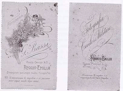 Intorno agli anni settanta, in provincia di Reggio Emilia, sorgono i primi studi fotografici perfettamente attrezzati; sulla scia di questi, altri se ne impiantarono. Il Bassi fu uno tra i primi a lavorare fuori dalla città capoluogo; se in un primo tempo la sua camera oscura era allestita all'interno di un pittoresco carrozzone e lo studio sotto una particolare tenda mobile, che doveva richiamare in gran numero la popolazione dei piccoli centri rurali, dal 1880 anch'egli si dota dei più moderni ritrovati. Sopra la propria abitazione allestì una mansarda in gran parte coperta di cristalli, dotata di tende scorrevoli che permettevano la realizzazione di riprese fotografiche in qualunque stagione dell'anno e una sala di posa ricca di tutti gli strumenti del mestiere: dai pannelli riflettenti per proiettare la luce naturale su parti del volto, ai poggiatesta, che bloccavano il volto del cliente evitando spiacevoli effetti di mosso, dai fondali, dipinti con giardini dagli elementi neoclassicheggianti, alle immancabili colonnine, sedie o piccoli tavoli, pretesti per pose convenzionali. Un modesto salotto precedeva la sala di posa, un luogo per intrattenere i clienti, che divenne poi salotto politico, importante fucina per il nascente movimento socialista; qui, insieme ad altri attivisti, il Bassi organizzò le lotte di quegli anni; questo divenne inoltre biblioteca per raccogliere quelle pubblicazioni "indesiderate" dalla borghesia locale, ma necessarie alla classe contadina e operaia per prendere coscienza e ospitò addirittura la redazione di un piccolo giornale, La Fiaccola che il fotografo diresse per almeno un anno. Una vita molto vivace caratterizzò, in questi primi anni, l'attività dello studio correggese di cui possiamo raccogliere altre informazioni, più vicine all'interesse specifico della ricerca, nei versi (termine tecnico che indica il tetro) delle "carte de visite". Attraverso la raccolta e la disposizione cronologica di questi è stato possibile ricostruire importanti segmenti di storia dell'atelier: "Fotografia viaggiante" si legge sulle primissime fotografie, chiaramente riferite al periodo di "itinerante"; vere e proprie pubblicità recitano altri. "Si fanno ritratti a la Rembrandt, a la Walerè, trasparenti in vetri, in seta, di grandezza naturale, brillanti, di fantasia, uso comune, riproduzioni... si garantisce qualunque lavoro a perfezione ed a prezzi modici". Il correggese ebbe sempre cura di precisare questa caratteristica, grazie alla tecnica più veloce ed economica e a una particolare attenzione, visto il suo impegno politico, al sociale. L'elenco che precede, altro non è che una conferma di quanto già detto in precedenza: il ritratto è per gli ateliers di fine Ottocento un genere ben definito, ricco di schemi precisi e ben collaudati, che permettono un successo sicuro sul pubblico e di regole a cui neppure l'atelier di provincia del Bassi poteva sottrarsi. Ed ecco che il fotografo può ritrarre solo la testa o il busto, in piedi, di profilo, variando la provenienza della luce, che, se ad esempio proveniva da dietro illuminando la testa a tre quarti, dava l'effetto alla Rembrandt. il risultato: un vocabolario di pose stereotipate. Più diversificati i ritratti di bambini, "grande specialità" dello studio correggiese; molti fotografi si cimentavano proprio in questo settore, reso arduo per le difficoltà tecniche nell'immortalare il vivace soggetto. Comprensibili i problemi nel fotografare un piccolo che certo non ne voleva sapere di stare immobile per molti secondi, con risultati che si possono immaginare. Si va così dal fanciullo impacciato costretto in una posa adulta, al bambino sorridente, ma ahimè leggermente sfuocato! Piccoli e grandi gruppi, ripresi in studio o all'aperto concludono questa breve carrellata, con un'attenzione particolare per l'armonia e la forma nella disposizione.