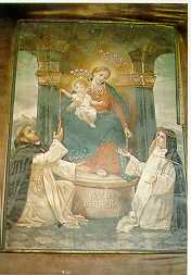 | Edicola mariana all'incrocio fra via S. Martino e Via S. Pellegrino. Sul frontale della nicchia, fra le diverse immagini, sono visibili tracce di un affresco preesistente | Correggio, Via Saltini: tabernacolo devozionale. La Madonna del Rosario ed il Bambino mentre porgono la corona ai Santi Domenico e Caterina |