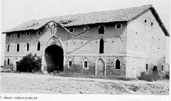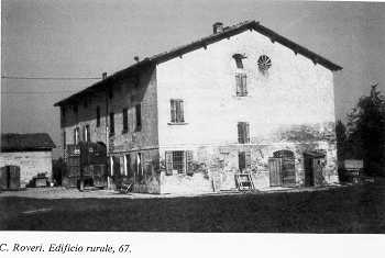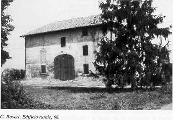 67 Mappa del territorio C. ROVERI alt. m. 37 IGM F 74 II SO Edificio rurale a corpi giustapposti in parallelo con copertura a due falde a colmo costante e porta morta a sesto ribassato. Il civile su due piani e sottotetto, rivolto a sud, ha luci regolari e simmetricamente distribuite. Nel fienile della parte rustica č notabile una ghiera a traforo in laterizio. | ![]() |
