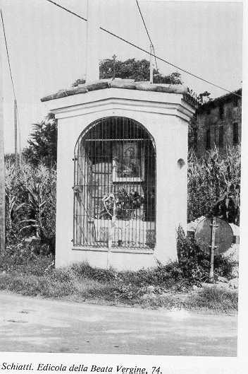 74 Mappa del territorio C. SCHIATTI alt. m. 28 IGM F 74 II NO Costruzione rurale a volume compatto orientato in direzione nord-sud , con tetto a quattro falde e colmo costante . Il civile, situato a mezzogiorno, presenta due piani e il sottotetto con luci regolari e simmetricamente distribuite. In angolo tra le vie S. Pellegrino e San Martino č osservabile una edicola ottocentesca con ampia nicchia in volto e cornicione modanato di sottotetto. Conserva una immagine votiva della Beata Vergine. Sono visibili tracce di un affresco preesistente(1) (1)LIGABUE 1990, 84. | ![]() |