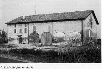 79 Mappa del territorio C. VALDE' alt. m. - IGM F 74 II SO Edificio rurale a corpi giustapposti in linea con porta morta a sesto ribassato; la copertura č a due falde a colmo costante . Il civile, situato a ponente, ha luci regolari e simmetricamente distribuite. Il rustico presenta nel fronte sud un portico tamponato a tre luci a sesto ribassato. | ![]() |