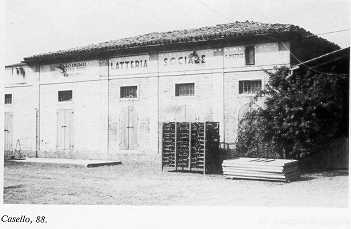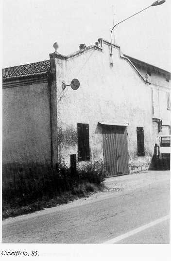 85 Mappa del territorio CASEIFICIO alt. m. - IGM F 74 II SO La cartografia dell'I.G.M. riporta la denominazione di "C. Capretti". La struttura del caseificio č a pianta rettangolare su un unico livello . Il fronte strada presenta copertura ad attico con fastigo mistilineo in sommitą e pigne ai vertici laterali. Un secondo caseificio a struttura doppia rimane lungo la via per Modena. I prospetti mostrano un attico curvilineo a fronte della copertura: le luci sono archivoltate. All'incrocio con la via Sinistra Tresinaro č osservabile una maestą a pilstrino ottocentesca con cuspide e croce in vertice ; la nicchia in volto č protetta da una grata frontale. | ![]() ![]() |