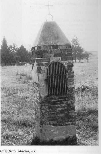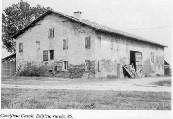 86 Mappa del territorio CASEIFICIO CASSOLI alt. m. - IGM F 74 II SO Notabile un edificio rurale tardoottocentesco ad elementi giustapposti in linea con porta morta architravata. Il tetto č a due falde con colmo indifferenziato. Il civile č disposto a ponente. | ![]() |