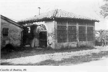 89 Mappa del territorio CASELLO DI BUDRIO alt. m. - IGM F 74 II SO Casello isolato a pianta quadrangolare con copertura a quattro falde, ora in stato di abbandono, lungo via d'Imbreto. I prospetti sono caratterizzati da luci architravate con tamponature a "gelosia" composte da file di pilastrini a sezione triangolare mentre la porta di ingresso sovrastata da una lunetta semicircolare raggiata(1). (1)MUSSINI, MURARO 1989, 150-151. | ![]() |