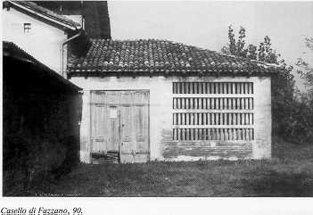 90 Mappa del territorio CASELLO DI FAZZANO alt. m. - IGM F 74 II SO Casello con struttura accorpata a pianta quadrangolare e copertura a tre pioventi. Le griglie sono composte da quattro file sovrapposte di pilastrini in laterizio a sezione quadrangolare disposti di spigolo(1). (1)MUSSINI, MURARO 1989, 153-154. | ![]() |
