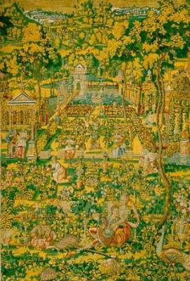 Diremmo Venere e Marte l'elegante dama e il rilassato guerriero fissati in un tenero colloquio amoroso sul primo piano del terzo soggetto dei Giardini, se i cani, le pelli raccolte in una rete e il corno non qualificassero l'uomo come un cacciatore. La sua esatta identità è rivelata dalla lancia posata ai piedi: è Cefalo, appoggiato alle gambe di Procri. La loro serena unione, descritta nelle Metamorfosi (VII, 797-803), sarà di lì a poco distrutta: Procri morirà colpita per errore dalla lancia di Cefalo. Nulla traspare però nell'arazzo del luttuoso seguito: dietro la coppia si dispiega un vago giardino fiorito, con pergole, arcate, statue, corsi d'acqua, di cui si prendono cura due alacri giardiniere, mentre altre coppie si abbracciano tra la verzura.