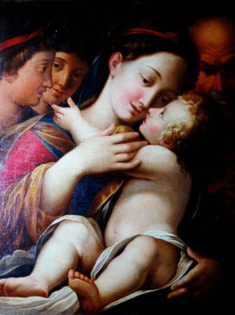 Tradizionalmente attribuita a Giulio Cesare Amidano, questa tela può essere confermata al pittore parmense, in una fase non ancora influenzata dall'opera di Bartolomeo Schedoni. E' noto che nell'ultima parte della sua attività l'Amidano prese ad esprimersi nei modi del maestro modenese, al punto che alcune opere (come la Santa Cecilia del Museo di Capodimonte a Napoli) sono tuttora contese tra i due artisti. La Sacra Famiglia di Correggio è invece concepita nel solco della scuola parmense cinquecentesca, e l'autore mostra di essere un epigono di quella tradizione che aveva avuto in Correggio, Parmigianino, Gandini, Anselmi e Bedoli i principali rappresentanti. In particolare sono evidenti i rimandi a Girolamo Bedoli, specie nella tipologia e nell'atteggiamento della Vergine, che ricorda la Madonna col Bambino, san Giovannino e angeli (Parma, Santo Sepolcro), un'opera commissionata nel 1566. Nelle piccole dimensioni della tela le figure riempiono tutto lo spazio a disposizione, realizzate con una madreperlacea accuratezza che conferisce alla composizione un che di vagamente "neoclassico". Curioso il fatto che il san Giuseppe, quasi incastrato nell'angolo, ricordi, per tipologia e collocazione, il personaggio in alto a destra nel Gesù fra i dottori di Albrecht Durer (Madrid, Collezione Thyssen), uno dei capolavori dell'attività veneziana del maestro tedesco. [GPL] Bibliografia: Bertolini 1930, p. 22; Finzi 1949, p. 33; Finzi 1968, p. 173.