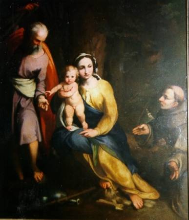 Le vicende del quadro sono state ricostruite da Massimo Pirondini nella sua monografia su Boulanger del 1969. La copia del quadro dell'Allegri, originariamente nella cappella Munari nella chiesa di San Francesco a Correggio e oggi agli Uffizi, fu eseguita dal pittore francese nella seconda metà del marzo 1638 e collocata, nella notte del 2 aprile dello stesso anno, al posto dell'originale, fatto contemporaneamente trafugare su ordine del duca di Modena Francesco I d'Este per la propria collezione. Vane furono le rimostranze dei correggesi, ed analoga vicenda dovette svolgersi negli anni 1640-42 a Reggio Emilia, con il furto, sempre su ordine del duca, della Notte del Correggio dalla chiesa di San Prospero, e la successiva sostituzione con una copia eseguita dal Boulanger, nel frattempo assunto in permanenza al servizio di Francesco I. L'opera qui esaminata è una copia fedele della tela dell'Allegri, che dal 1649 si trova a Firenze in seguito a uno scambio di quadri fra le collezioni estensi e quelle medicee. Il Correggio aveva tratto il soggetto dell'opera, databile attorno al 1520, da un episodio del Vangelo aprocrifo dello pseudo Matteo, riguardante l'omaggio che, durante la fuga in Egitto, san Giuseppe fa al Bambino di alcuni datteri, colti da una palma che aveva spontaneamente abbassato le fronde. Il pittore aveva inserito sulla destra il san Francesco, il santo titolare della chiesa originaria, collocando i sacri personaggi sulla soglia di un bosco fittissimo. Secondo il carteggio citato da C. A. Lumini risulta che nel 1788 il quadro del Boulanger era da tempo stato tolto dalla chiesa e collocato nella camera del padre guardiano del convento di San Francesco. [GPL]. Bibliografia: Lumini 1909, p. 258; Bertolini 1930, p. 31; Finzi 1968, p. 174; Pirondini 1969, pp. 8-12; Antiquari Reggiani, 1989, s.p.