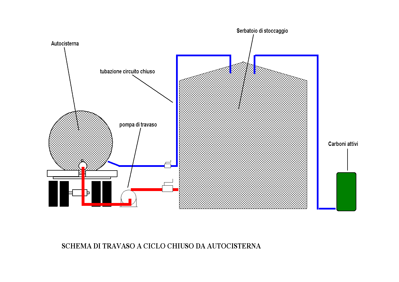 Per il resto si può parlare di perdite a carattere evaporativo dai serbatoi in deposito o dai miscelatori per le sostanze caratterizzate da elevate tensione di vapore o a basso punto di ebollizione, cioè estremamente volatili. Le soluzioni apprestate sono di due ordini: o il convogliamento di tutti gli sfiati in atmosfera ad impianti di abbattimento o l’effettuazione del carico-scarico di materia prima volatile con il sistema della polmonazione, cioè del ritorno dei gas alle autocisterne, come si può vedere nello schema seguente: