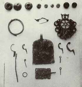 Le fuseruole in terracotta che si raccolsero in tre vasi ossuari connotano in senso femminile altri corredi, uno dei quali comprendeva anche un elaborato fermaglio per cintura in lamina di bronzo, decorato da motivi a sbalzo, composto di due parti, il "maschio" e la "femmina" (figg. 6 e 7). La cronologia del sepolcreto è stata determinata tra la metà del VI ed il pieno V secolo a.C.. La perdita dei corredi non consente ulteriori precisazioni.