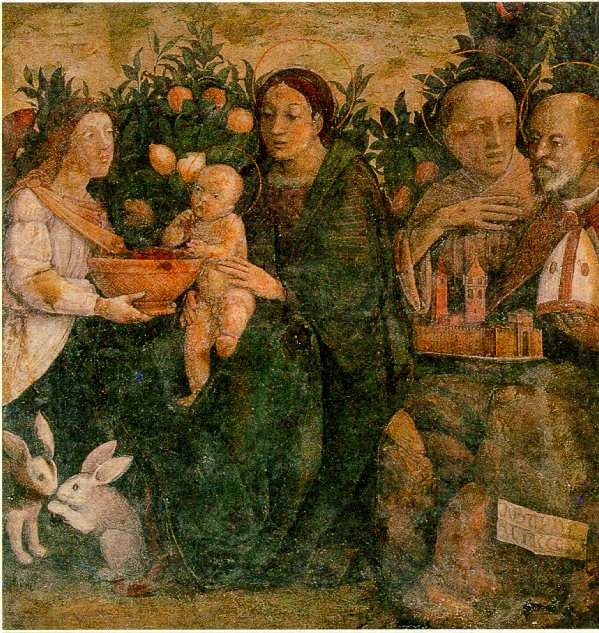 | Fig 1 - Madonna col Bambino i Santi Francesco e Quirino. Affresco trasportato su tela, cm 112 x 94 (1507-11). Modena, Galleria Estense. (Foto Manzotti). E' tradizione che l'affresco sia stato eseguito per l'antica chiesa di San Quirino, annessa al castello dei da Correggio. In occasione dell'abbattimento di detta chiesa, nel 1514, il dipinto venne salvato con l'intero pezzo di muro retrostante, e portato in Santa Maria della Misericordia. Le successive vicende lo hanno collocato presso la Galleria Estense, trasferito su tela, dove attualmente giace nei depositi. Si tratta di una delle prime opere documentate dell'Allegri, eseguita forse nel 1507, come suggerisce il Quintavalle, e rifinita nel 1511 secondo la data che appare in basso a destra. Risulta evidente il momento mantegnesco del giovane pittore, sottolineato da una notevole libertà e freschezza. Non compaiono i vincoli architettonici: la Madonna e i Santi conversano spontaneamente in un giardino signorile, presso una siepe di cedri, mentre i conigli mimano un incontro effusivo. L'opera è molto legata alla città natale. Il giardino è probabilmente quello dei Conti; i due santi sono i più amati dai correggesi; e San Quirino, di cui la dinastia locale sta rinnovando il culto, regge una esplicita dedicatio urbis, ovvero l'immagine della città offertagli in protezione. Quest'ultimo elemento, oltre ad essere un prezioso documento urbanistico, ci tramanda il segno della ascesa di Correggio al ruolo di vera piccola capitale. Si auspica che l'affresco possa essere di nuovo conservato a Correggio, nelle sale nobili dei Palazzo dei Principi, ossia nel Museo-Pinacoteca. |