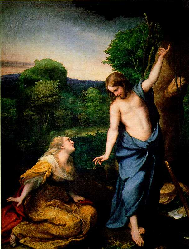 | Fig. 3 -"Noli me tangere". Tavola riportata su tela, cm 30 x 103 1520 circa). Madrid, Museo del Prado. (Foto Manzotti). La bellissima scena nella quale si vede l'episodio susseguente alla Resurrezione, quando il Cristo appare alla Maddalena ordinandole però di non toccarlo, è impaginata dal Correggio in modo magistrale. L'equilibrio del rinascimento, che vuole il rispetto degli assi verticale e orizzontale del dipinto, è mantenuto sul piano geometrico ma è risolto in modo dinamico. Il fascino di quest'opera indimenticabile è affidato alla vivezza dei tre colori fondamentali in primo piano (il rosso, il giallo-oro e il blu) ma anche alla forza avvolgente del verde della natura. Le figure sono profondamente legate al paesaggio: il terzo polo spaziale, insieme alle due teste, è infatti l'emergenza montana, nella quale non è difficile riconoscere il profilo della Pietra di Bismantova. Al sontuoso vestito della Maddalena fanno riscontro, sulla destra in basso, gli umili attrezzi dell'antico lavoro contadino: così il "pittore di Lombardia" sa coniugare i prelievi dal mondo delle corti con le annotazioni più vere dell'umile cultura materiale. |