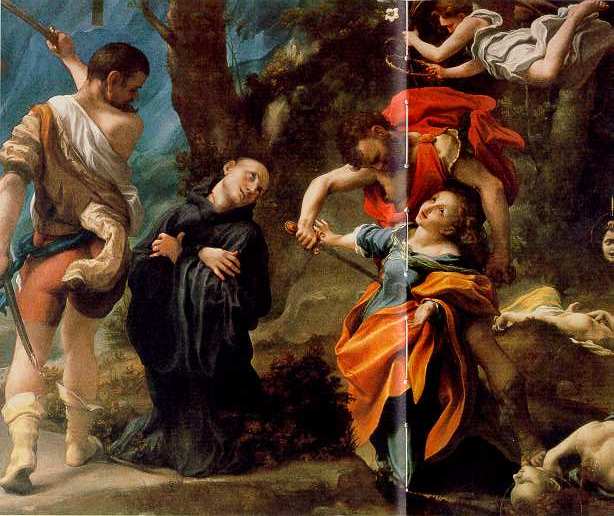 | Fig. 5 - Martirio di quattro Santi. Olio su tela, cm 158 x 184 (1524-26). Parma, Galleria Nazionale. (Foto Manzotti). La tela, che fu eseguita per la Cappella Dei Bono nella chiesa di San Giovanni Evangelista, a Parma, rappresenta il martirio dei santi Placido, Flavia, Eutichio e Vittorino. I corpi di questi ultimi due sono già decapitati, sulla destra, La complessità compositiva del tema ha spinto il Correggio a concepire un racconto a lunghe curve ansate, partendo dal carnefice quasi fuori campo che porta via una testa, e seguendo le varie figure fino all'angelo incoronante. Si percorre così tutto il dipinto, partecipando agli eventi e alle relative commozioni, in uno spazio moltiplicato e ricchissimo di invenzioni pittoriche. |