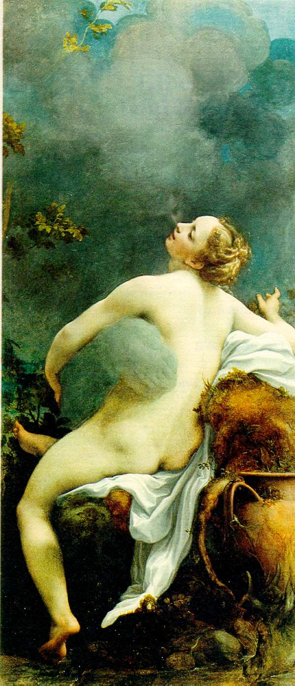 | Fig. 8 - Giove ed Io. Olio su tela, cm 163 x 74 (1531 circa). Vienna. Kunsthistorische Museum (Foto Manzotti). Dopo i lunghi anni parmensi Antonio Allegri si ritira nella città natale, probabilmente nell'inverno del 1530, per un periodo non ipotizzabile sul piano degli intenti. Di fatto resterà a Correggio sino alla repentina morte, che lo coglierà quarantacinquenne nel 1534. Nella sua piccola casa-studio, in Borgovecchio, creerà la serie stupenda degli Amori di Giove, i cui soggetti gli sono richiesti da Federico II Gonzaga, duca di Mantova. La serie delle quattro tele costituisce il più sublime canto di ogni tempo sulla bellezza e sulla dolcezza dell'amore umano, nobilitato nell'empito divino-mitologico. Indimenticabili gli episodi di Leda, visitata da Giove sotto forma di cigno, e di Io, cinta nell'amplesso della nuvola in cui si cela l'olimpico amante. Questo dipinto verticale è compositivamente concentrato sul corpo nudo della fanciulla d'Argo, sdutto nello stupendo equilibrio tra ardore ed abbandono, ove la scelta di un chiasma meravigliosamente difficile non prevale sulla totale pervasione amorosa dei sensi e dell'anima. Forse davvero nelle ultime opere della sua vita il Correggio trasfuse la sua piena esperienza di uomo, nella vicinanza tranquilla della sua giovane sposa. |