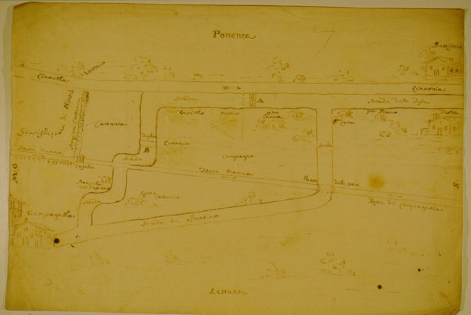Si individuano: chiesa di Campagnola (schizzo), "Strada del Reatino", "Linarola", "Ponte della croce", "Fossa Manna", "Fossa di Campagnola", "strada della testa" e le possessioni "Battistona", "Bosco" e "Testa".