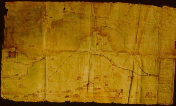 Accurata rappresentazione del centro storico di Campagnola, degli edifici rurali ed ecclesiastici, della viabilita' e dell'idrografia. Contiene parecchie indicazioni relative alla toponomastica. La prima parte della legenda risulta difficilmente leggibile: