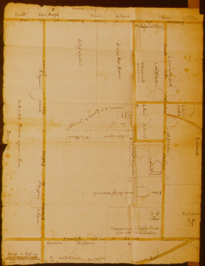 Individuazione del "Borgo di Fabrico", "S. Genesio" e dei vari edifici con relativa proprieta'. Evidenziate le strade : "stradone da Fabrico a S.Genesio", stradone che va al casino Barbanti et alla vale", "strada dalla Calzolara a' Fabrico", "stradello che va a Rolo". Viene inoltre segnalato con le lettere A B C D (E) un "sentiero segnato a' Ponti(?)".