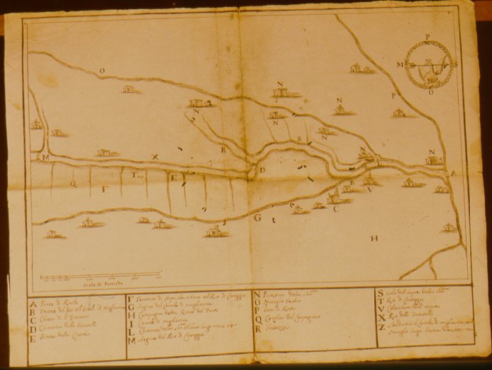 Idrografia Naviglio Vecchio, Canale di Migliarina fino a Fossa Raso.Individuazione di vari edifici ed opere idrauliche, come: "ponte di Ruolo", "chiesa di S.Giovanni", "Chiavica della Ser.ma", "colombara dell'acqua". Vedi anche AMP/142/8 e AMP/6