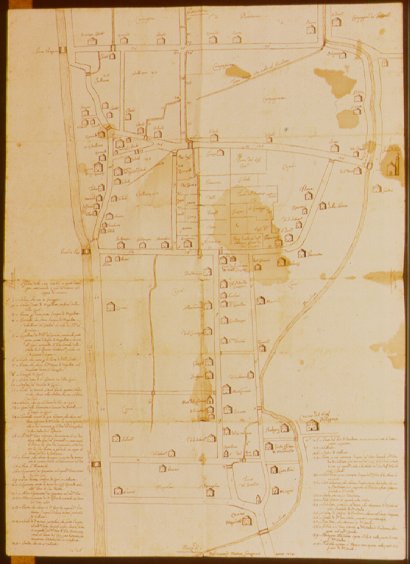 Una accurata legenda fornisce informazioni sugli elementi della carta. Vengono rilevati: maesta' all'incrocio fra via Naviglietto e Prov.le per Campagnola, "capellina" all'incrocio fra Prov.le per Campagnola e via S. Orsola, "Oratorio di S. Lodovico", chiesa di Rio, un edificio religioso a nord di Rio, il "ponte dei Luppi", il "ponte de' Pasi", il "ponte Vettigano". si rilevano le zone: "Capri'", "Salliceto", "Bondione", "Campagnetta", "Campagna de' Fossatelli". La carta, connessa alle carte P/III/2 e B/G/1, fornisce un quadro storico dei mutamenti della proprieta' confinante con Via Affarosa.