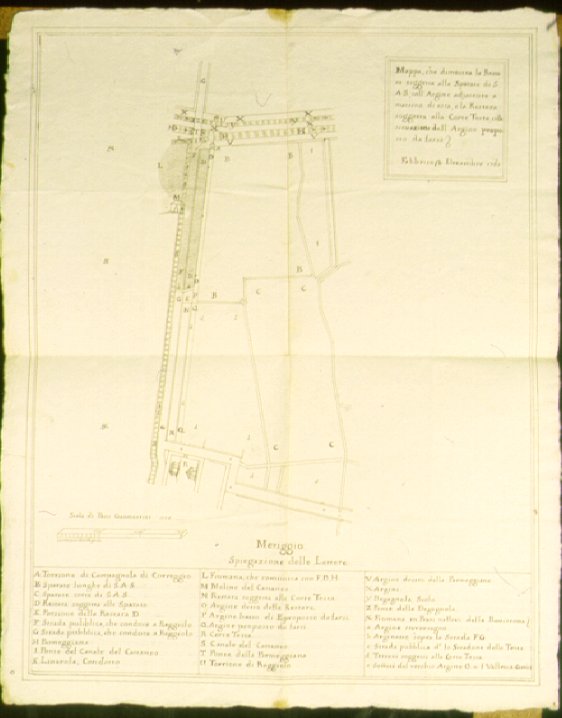Individuazione del mulino, dei Torrioni di Campagnola e di Reggiolo, della Corte Testa e dei principali elementi del territorio.