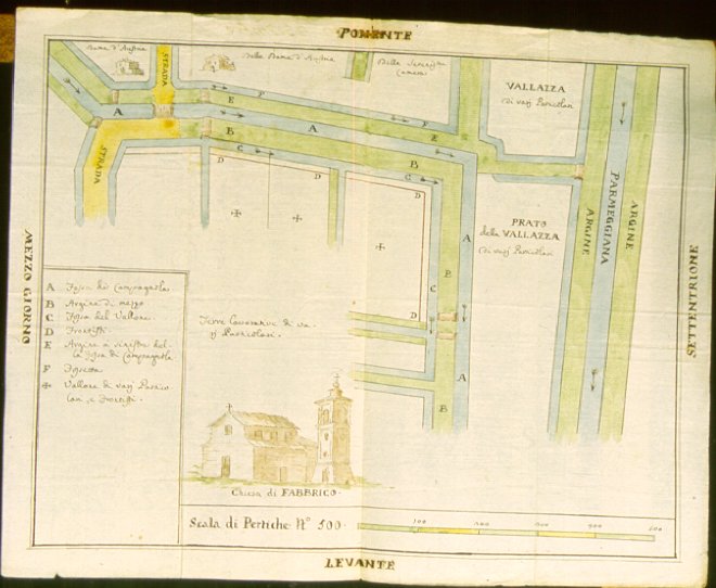 Idrografia delle valli di Fabbrico, in particolare "Parmeggiana", "Fossa di Campagnola" e "Fossa del vallone" e indicazione dei proprietari. Rappresentazione a china in chiaroscuro della Chiesa di Fabbrico.