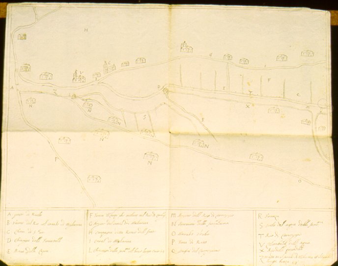 Idrografia Naviglio Vecchio, Canale di Migliarina fino a Fossa Raso; . Individuazione di vari edifici ed opere idrauliche, come: "ponte di Ruolo", "chiesa di S.Giovanni", "Chiavica della Ser.ma", "colombara dell'acqua". Schizzo preparatorio ad AMP/141/13 ma rovesciata, con Nord a sinistra anziche' a destra.