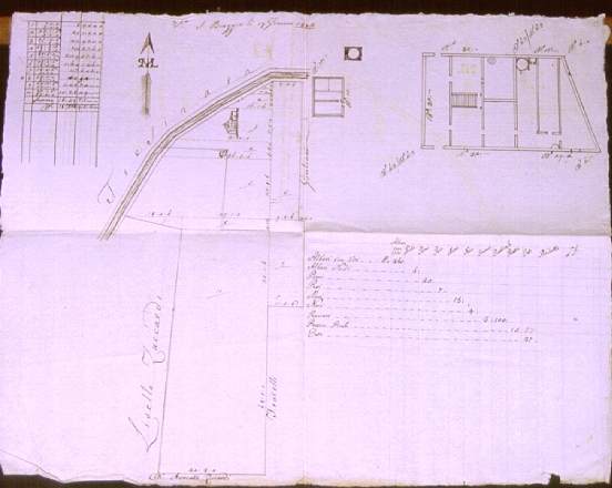 Esempio di mappa, pianta casa e rilievo arboratura su singolo foglio. proprieta' fra Zuccardi e Giuliani