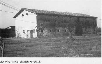 2 Mappa del territorio AMERICA NUOVA alt. m. 37 IGM F 74 II SO A questo toponimo corrisponde un edificio rurale situato al lato sud della via d'Imbreto. La tipologia è ad elementi giustapposti in linea, orientata in direzione est-ovest, con porta morta a sesto ribassato e copertura a due falde a colmo costante. Il civile su tre piani è situato a ponente. Proseguendo la via d'Imbreto verso il cavo Argine si distingue una costruzione rurale a corpi giustapposti e porta morta a sesto ribassato, con copertura a due falde a colmo indifferenziato. Il civile su tre piani, situato a levante, ha luci regolari e simmetricamente distribuite. Sul lato nord della strada rimane infine un edificio rurale a corpi giustapposti in linea con porta morta a sesto ribassato e copertura a due falde a colmo costante. Il civile su tre piani, evidenziati all'esterno da cordoli lisci, ha luci regolari e simmetricamente distribuite. | ![]() |