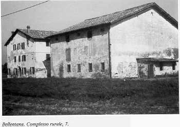 7 Mappa del territorio BELLENTANA alt. m. - IGM F 74 II SO Nucleo rurale a corpi separati. Il casino civile, situato a ponente, sviluppa una pianta rettangolare su tre piani con copertura a due falde a colmo costante; l'ingresso è archivoltato e le luci sono regolari e simmetricamente distribuite. Il rustico , con stalla e fienile sovrapposto, presenta un portico archivoltato a due luci sul fronte ovest. | ![]() |