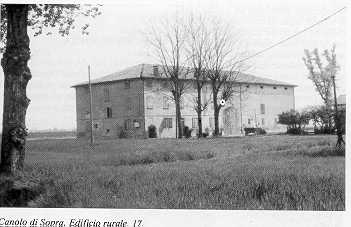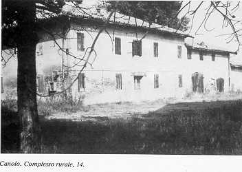 17 Mappa del territorio CANOLO DI SOPRA alt. m. - IGM F 74 II NO Antica possidenza dell'Opera Pia dell'Ospedale di S. Maria di Reggio. Rilevante edificio rurale ad elementi giustapposti in linea con porta morta a tutto sesto . Sviluppa un volume compatto a piantta rettangolare con tetto a quattro falde a colmo indifferenziato. Il civile è disposto a ponente. | ![]() |