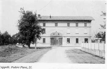 21 Mappa del territorio CAPPELLI alt. m. - IGM F 74 II NO Interessante costruzione a corpi giustaposti in linea su ampia pianta quadrangolare, con porta morta a sesto ribassato e copertura a quattro falde a colmo indifferenziato , orientato in direzione nord-sud. Il civile su tre livelli è disposto a sud. Un cordolo marcapiano lineare a dente di sega corre tra il pianoterreno ed il primo piano. Nel prospetto rivolto alla strada oltre alla scritta a caratteri cubitali identificativa del "Podere Piave"-già possidenza dell'Ospedale S. Maria di Reggio Emilia-sono presenti ai lati della porta morta due formelle riportanti il millesimo "MCMXXV" e lo stemma della proprietà. | ![]() |