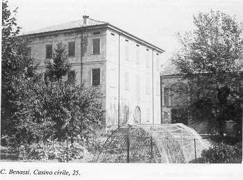 25 Mappa del territorio C. BENASSI alt. m. - IGM F 74 II NO La cartografia dell'I.G.M. riporta il toponimo "Foglia". Elegante casino civile di matrice ottocen-tesca a volume compatto su tre piani e sottotetto con copertura a padiglione. I livelli sono sottolinati all'esterno da un cordolo marcapiano mentre il piano terra è caratterizzato da un bugnato gentile. L'ingresso è archivoltato e le luci regolari e simmetricamente distribuite. In adiacenza del civile si sviluppa in direzione est-ovest un edificio a pianta rettandolare su due piani coperto a quattro falde con cresta frangifuoco. Notabile è il prospetto a sud con portico e loggia soprastante, tamponati, ripartiti da colonne binate con base e capitello. | ![]() |