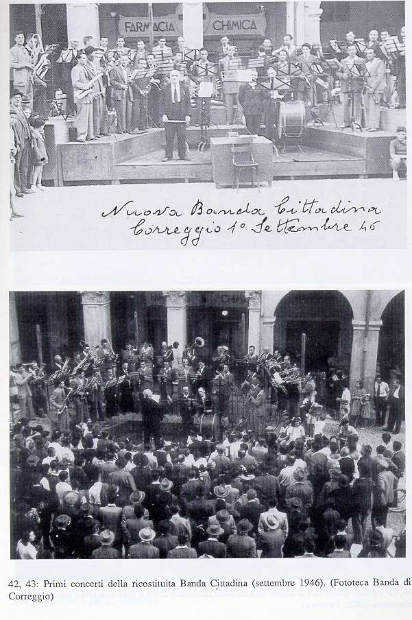 La Banda Cittadina venne ricostituita nel 1946 per iniziativa dei suoi vecchi animatori (Figg. 42/43).4 All'inizio del 1947 il Consiglio Comunale, 5 nonostante le difficoltà frapposte dalla Giunta Provinciale Amministrativa, decise la ripresa dell'attività della Scuola di Musica e l'ufficializzazione del ricostituito Corpo Bandistico. Venne dato, con un modesto compenso mensile, l'incarico didattico della prima e la direzione della seconda a Romeo Boselli e fu concesso un locale presso il Palazzo dei Principi come sede di entrambe. La scuola riprese a funzionare con lezioni quasi quotidiane a una trentina di allievi che nella maggior parte dei casi erano membri (o candidati a diventarlo) della Banda; quest'ultima riceveva dal Comune contributi saltuari che 'ripagava' esibendosi durante cerimonie ufficiali. 6