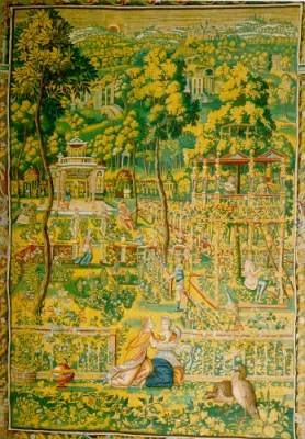Nel primo panno (cm 250 x 174) due figure sul primo piano descrivono l'episodio di Giove che, assunto l'aspetto di Diana (si noti la falce di luna sulla fronte della donna a sinistra), corteggia e conquista la ninfa Callisto (Metamorfosi, 11, 422 ss). E possibile che il pavone appollaiato sulla balaustra a breve distanza dalla coppia alluda a Giunone, la gelosa consorte di Giove; anche una delle statue appaiate al varco d'una retrostante balaustra mostra una donna che tiene presso di sé un pavone: ancora Giunone. Più in profondità, presso il padiglione dello sfondo, si vede una figura femminile vestita di giallo che ne percuote un'altra vestita di rosso la quale, scaraventata a terra, gesticola spaventata: dev'essere Giunone che assale Callisto prima di trasformarla in orsa (Metamorfosi, II, 477-478: " ... et adversa prensis a fronte capillis / stravit humi pronam. Tendebat bracchia supplex..."). Le altre figure dell'arazzo sembrano estranee alla narrazione mitologica, che non si risolve dunque, non si conclude con la conseguente "metamorfosi"; ma ciò basta a conferire un alone fantastico alla veduta paesistica, a spostare in una sfera letteraria le rigogliose aiuole, i vialetti ricoperti dai rampicanti, l'aereo loggiato su cui una dama pizzica le corde di un liuto. Un'analoga loggetta aperta, sostenuta da erme-cariatidi al piano superiore, ricompare in uno dei soggetti della Storia di Pomona di cui si è detto: nell'Offerta a Pomona di Genova, Museo di Palazzo Bianco, e nella sua replica a Bruxelles, collezione della Royal Bank of Canada.