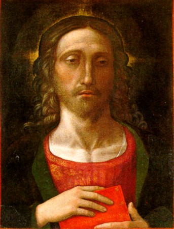 Secondo un'ipotesi formulata dalla storiografia locale (Bertolini 1930, Ghidiglia Quintavalle 1959, Ghidini 1976) il dipinto potrebbe aver fatto parte della raccolta dei conti di Correggio, andata poi dispersa con la caduta del principe Siro (1634). Da questi sarebbe finito nelle mani dei fratelli Contarelli, amministratori di una parte (lei beni del prinicipe. Anche se l'importanza dei Contarelli nelle ultime vicende di Siro ci sembra abbastanza trascurabile, il quadro entra probabilmente in loro possesso perlomeno nella seconda metà del XVII secolo: infatti nell`Inventario dei beni di Francesco Contarelli figlio di Angelo, fatto ad istanza dei tutore (1697, AOP, Archivio Contarelli, b. 2, fase. 6) compare un "quadretto piccolo con cornici coll'effige del Salvatore". Il lungo uso devozionale dovette senz'altro danneggiare il dipinto e farne perdere la coscienza dell'altissima qualità, tanto che esso non si trova neppure menzionato nel minuziosissimo inventario dei beni dell'ultima dei Contarelli, Caterina, morta nel 1851. Finito in mezzo ad "oggetti fuori d'uso" che la Congregazione di Carità, erede della Contarelli, vendette nel 1914 a due rigattieri di Correggio, il solo quadro fu poi ceduto da questi ultimi, per 10 lire, a Carlo Foresti di Carpi, che lo offrì al marchese Matteo Campori di Modena per 250 lire. Affidato dal Campori al restauratore Moroni di Milano, il dipinto fu riconosciuto come opera del Mantegna da Gustavo Frizzoni in un suo articolo su "L'Arte" del 1916. Nel contenzioso fra vecchi e nuovi proprietari che seguì tale clamorosa attribuzione, ebbe partita vinta la Congregazione di Carità di Correggio che, con sentenza del Tribunale di Modena in date 30 gennaio - 3 febbraio 1917, fu riconosciuta proprietaria legittima ed ottenne la riconsegna del capolavoro mantegnesco (BCC AOP n. 203). L'attribuzione del Frizzoni fu generalmente accolta dai successivi studiosi di Mantegna (fa eccezione la Tietze-Conrat, la quale però afferma di non aver visto direttamente il dipinto) e definitivamente confermata dal restauro del 1959, che, nonostante i danni di un'antecedente pulitura, rivelò una grande raffinatezza nella stesura della tempera. Sul libro portato dal Cristo vi è la scritta (oggi in gran parte abrasa) EGO SUM: NOLITE TIMERE (Luca, 24, 36), e altre iscrizioni caratterizzano i bordi dipinti del quadro. A sinistra vi è la frase disposta verticalmente MOMORDITE VOS MET IPSOS ANTE EFIGIEM VULTITS MEI ("straziatevi anche voi davanti all'immagine del mio volto") in cui alcune delle lettere sono ruotate di 45 gradi verso destra: una bizzarria presente anche nelle iscrizioni sul disegno della Giuditta (Firenze, Uffizi, 1491) e sulle incisioni con Ercole e Anteo derivanti da un originale mantegnesco (Lightbown, p. 202). Sul bordo inferiore vi è un'iscrizione, in parte scomparsa, in cui si può leggere ... JA P.C.S.D.D. MCCCCLXXXXIII D/V JA. Frizzoni diede questa interpretazione: Mantinia pinxit charitate sua (oppure cum suis) domino dicavit (oppure dono dedit) 1493 die VJannarii. Secondo Liglithown invece (p. 456) la scritta va letta Mantinia Palatinus Comes dono dedit 1493 die V Jantiarii: il titolo di Conte Palatino, dichiarato da Mantegna firmando i perduti affreschi nella cappella di Innocenzo VIII in Vaticano (1490) e rintracciabile anche nella firma ANDREAS MANTINIA C.P.F. sulla Madonna col Bambino e i santi Giovanni Battista e Maddalena (Londra, National Gallery), sarebbe ribadito nelle lettere P.C. sul quadro correggese. Lightbown però nella sua interpretazione della scritta tralascia completamente la lettera s., per cui la sua versione risulta incompleta (a meno che non la si voglia integrare inserendovi la s. col significato di sponte). Filippo Todini ravvisa nel dipinto tangenze con la pittura di Giovanni Bellini e Carpaccio sottolineando il "delicato chiaroscuro, libero da qualsiasi netto contorno". Ronald Lightbown rintraccia nella pittura delle Fiandre i lontani modelli iconografici, poi trapiantati nella pittura veneta, del Redentore, e scrive che "Mantegna riveste il modello fiammingo del proprio solenne classicismo, dando rilievo alla struttura del collo e articolando quella del torace secondo le modalità della scultura antica. Tuttavia il suo Cristo conserva quel carattere di 'Uomo dei dolori' che contribuiva al fascino e all'efficacia dell'immagine originale: il fondo nero, sul quale si riflette soltanto il pallido, dorato bagliore dell'aureola, che incorniciando 2 capo di Cristo emana raggi formanti un motivo cruciforme, i boccoli scuri e gli occhi dal taglio a mandorla, tipici dell'ultimo Mantegna, sono tutti elementi che contribuiscono a infondere al dipinto un senso di pathos contemplativo". Il Redentore può a buon diritto annoverarsi fra i capolavori dell'ultimo Mantegna. La delicatezza espressa dal pittore nelle lumeggiature sui capelli e nell'individuazione dei peli della barba e degli arabeschi dorati (oggi in gran parte scomparsi) sullo scollo della rossa veste di seta moirée, contribuisce a conferire un tono di estrema raffinatezza alla tela, peraltro fortemente caratterizzata nella sua funzione devozionale dall'espressione insieme austera e malinconica del Cristo. La data 1493 è importantissima per individuare un punto fermo negli intensi e ancor oggi dibattuti ultimi anni di attività del maestro padovano, "in un periodo in cui l'artista stava tentando di trasformare il suo stile in uno nuovo che doveva presagire il classicismo del XVI secolo" (Todini). Frizzoni accostava la tipologia del viso del Redentore ai volti del Cristo sul sarcofago di Copenhagen e del san Giovanni Battista nella Pala Trivulzio (Milano, Castello Sforzesco), mentre la Ghidiglia Quintavalle ravvisava affinità con il san Michele della Madonna della Vittoria (Parigi, Louvre). Paccagnini e Todini giudicano il Redentore contemporaneo della Sacra Famiglia di Dresda, mentre Lightbown è dell'opinione che al quadro di Correggio "per la concezione di fondo e per certi 