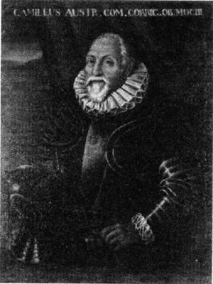 Camillo (1533-1605), figlio del conte Manfredo e di Lucrezia d'Este, nel 1551 venne compreso nell'investitura di Correggio, concessa da Carlo V, assieme ai fratelli e ai cugini. Nel 1569 aprì la zecca di Correggio e nel 1572 partecipò alla battaglia di Lepanto. Orientò la politica della contea in senso decisamente filospagnolo. [VP] Bibliografia: Bertolini 1930, p. 14; Finzi 1949, p. 34; Finzi 1968, p. 298.