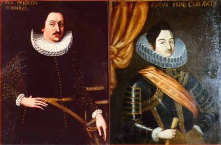 Entrambi i ritratti raffigurano Giovanni Siro da Correggio (1590-1645). Figlio illegittimo del conte Camillo, fu legittimato nel 1591 e, superate numerose difficoltà, succedette al padre nel 1605. Riuscì ad ottenere il titolo di principe del Sacro Romano Impero nel 1615, dopo aver sborsato una forte somma. Accusato di falsa monetazione, subì l'invasione delle truppe imperiali nel 1630. Fu poi dichiarato decaduto e il feudo di Correggio passò alla Spagna (1634), quindi al duca di Modena (1635) che da tempo tramava per impadronirsene. Nel primo ritratto il personaggio è raffigurato a mezzo busto: indossa una corazza attraversata da una sciarpa scarlatta e nella mano destra tiene una pergamena arrotolata. Sulla destra campeggia la scritta SYRUS PRIN. COR. AE. XIX; se essa fosse coeva al dipinto dovrebbe risalire al 1609, quando Siro era ancora soltanto conte. L'abbigliamento potrebbe alludere a un grado militare nell'armata imperiale o all'investitura principesca ottenuta. Si tratta in ogni caso di un ritratto ufficiale, con intenti fors'anche di legittimazione. Nel secondo ritratto il soggetto ha un'età più matura ed è raffigurato in abiti più ricercati: gorgiera bianca a lattughe, corpetto nero con bottoni dorati, maniche brune ricamate d'oro e l'immancabile spada al fianco. Sul ripiano a destra è riposto un cappello di cui rimane soltanto visibile la fascia gemmata che lo ornava. L'immagine che ne risulta è quella del nobile e gentiluomo che si ritrova in tanta ritrattistica coeva. A titolo di esempio si può confrontare un Ritratto di gentiluomo con cane di Sante Peranda, conservato nel Palazzo Ducale di Mantova, che è posto in un atteggiamento assai simile. Per ragioni di costume la datazione del dipinto non dovrebbe superare gli anni venti del Seicento. Di entrambi i ritratti non si conosce l'autore, tanto che potrebbe trattarsi anche di repliche da originali di migliore qualità, eseguite da modesti artigiani locali, forse su commissione di esponenti di famiglie correggesi rimaste legate alla memoria del principe anche dopo la sua disgrazia e caduta. [VP] Bibliografia: Finzi 1968, p. 243, figg. 217-218.