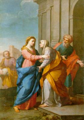 Come scrive Federica Rinaldi, la pala "inizialmente collocata nella vecchia chiesa di S. Giuseppe, in seguito alla soppressione di questa ultima, ritornò alla famiglia Pungileoni, di cui era proprietà, per essere poi venduta al conte Michele Bolognesi. Fino al 1968 era ancora collocata nella chiesa di S. Sebastiano, sul secondo altare a sinistra, e al di sopra dell'altare si poteva leggere la seguente iscrizione: "Visitatio B.V.M. / Acques Hier. Donnini cor. /ex voto / Francisci Pungileoni / Canonici et jureconsulti / pix. An. 1742'. " L'opera è posteriore al viaggio romano del Donnini. Secondo la Rinaldi nelle ultime opere del pittore "il divario dalle tele precedenti si concretizza nel passaggio da un colorismo intenso e vivacemente chiaroscurato ad un tonalismo modulato su gamme più delicate e sfumate, e nel senso di ariosità che pervade la Visitazione, con un chiaro rinvio alle opere del Maratti maggiormente suggestionate dal Sacchi e dai veneti". Negli anni di poco precedenti il Donnini aveva dipinto un'altra Visitazione (Pescia, Convento della Visitazione), di analogo schema compositivo. Rispetto all'opera toscana, nella tela correggese il pittore schiarisce la tavolozza, immergendo le figure in un'atmosfera di maggiore limpidezza e assegnando maggiore spazio al cielo, grazie all'eliminazione degli angeli in volo. Nel quadro di Pescia era maggiormente accentuato il senso di dinamismo delle figure (la Madonna che sale il gradino, la santa Elisabetta che si piega in avanti), nella tela di Correggio i personaggi sono più statici, ma è privilegiata l'espressione dei sentimenti (si veda l'incrociarsi degli sguardi delle due donne). Nell'opera, oltre all'influenza, già rilevata dalla Rinaldi, di Andrea Sacchi e Carlo Maratti (di quest'ultimo si veda in particolare la Visitazione in Santa Maria della Pace a Roma), sono evidenti i ricordi alla Visitazione del Guercino, oggi a Rouen ma in origine nel duomo di Reggio Emilia: simili sono la presenza dell'edificio in scorcio sulla destra, l'incontro delle donne sui gradini, il san Giuseppe in secondo piano a sinistra, la porzione di paesaggio fra quest'ultimo e la Madonna. Nel volto del san Zaccaria, col turbante e la morbida barba, sono pure ravvisabili suggestioni dalle opere tarde del pittore centese (Ripudio di Agar di Brera, Milano, Seppellimento di Cristo di Chicago). [GPL] Bibliografia: Arrivabene 1760, 1, p. 219; Oretti 1770-90 a, e. 526; Oretti 1770-90 b; Setti 1840, 111, e. 361; Pungileoni 1830, p. 353; Bigi 1873, p. 133; Bertolini 1930, p. 56; Finzi 1949, p. 48; Finzi 1968, p. 145; Ghidini 1976, p98, tavv. 56-57; Roli 1977, p. 255; Rinaldi 1979, pp. 27, 46, tav. 37; Roli 1990, p. 702.