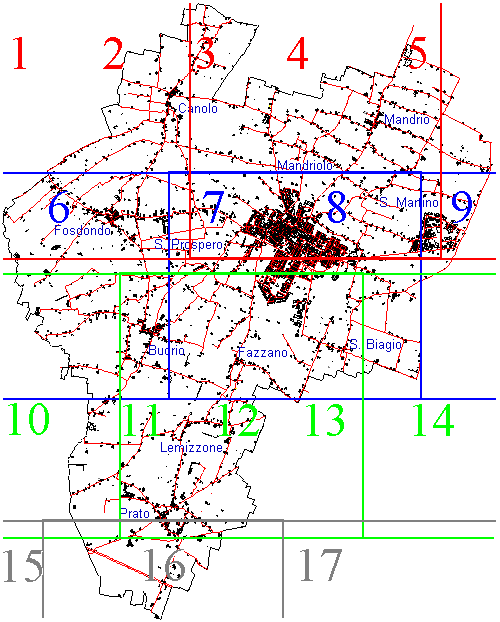 Le aree numerate individuano a grandi linee la porzione di territorio inquadrata dalla foto; si tenga conto che, anche orizzontalmente, si verificano sovrapposizioni con i fotogrammi precedenti e seguenti.