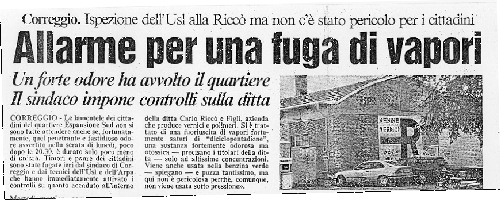 A questo proposito è però necessario chiarire che questo incidente, sulla base delle linee guida emanate dal Dipartimento di Protezione Civile con sede a Roma, è classificato come poco probabile e che l’intervento della squadra di emergenza interna sempre presente in stabilimento è in grado di garantire la neutralizzazione della sostanza nell’arco di un quarto d’ora dal momento dell’allerta. Ciò nonostante, per un principio di cautela che deve improntare l’attività dellle amministrazioni pubbliche preposte, è stato redatto il piano di emergenza esterno ed accuratamente informata la popolazione a rischio nell’immediato intorno dello stabilimento, con l’invio di schede di autoprotezione i cui contenuti sono da applicare correttamente una volta scattato l’allarme. Il segnale d’allarme è costituito da un messaggio parlato che il centralino dello stabilimento invia ai numeri telefonici delle imprese e della abitazioni citate nell’elenco allegato al piano.