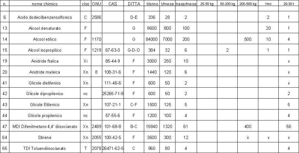 In totale il numero delle sostanze pericolose movimentate è pari a 72. Di queste, in termini di volumi trasportati, ben il 98% è rappresentato da sole 13 sostanze. La movimentazione annua è infine di 130.000 tonnellate. Altri dati relativi alle sostanze indicate e ai tempi e modalità di trasporto sono riassunte nella tabella seguente: