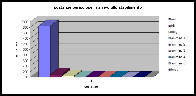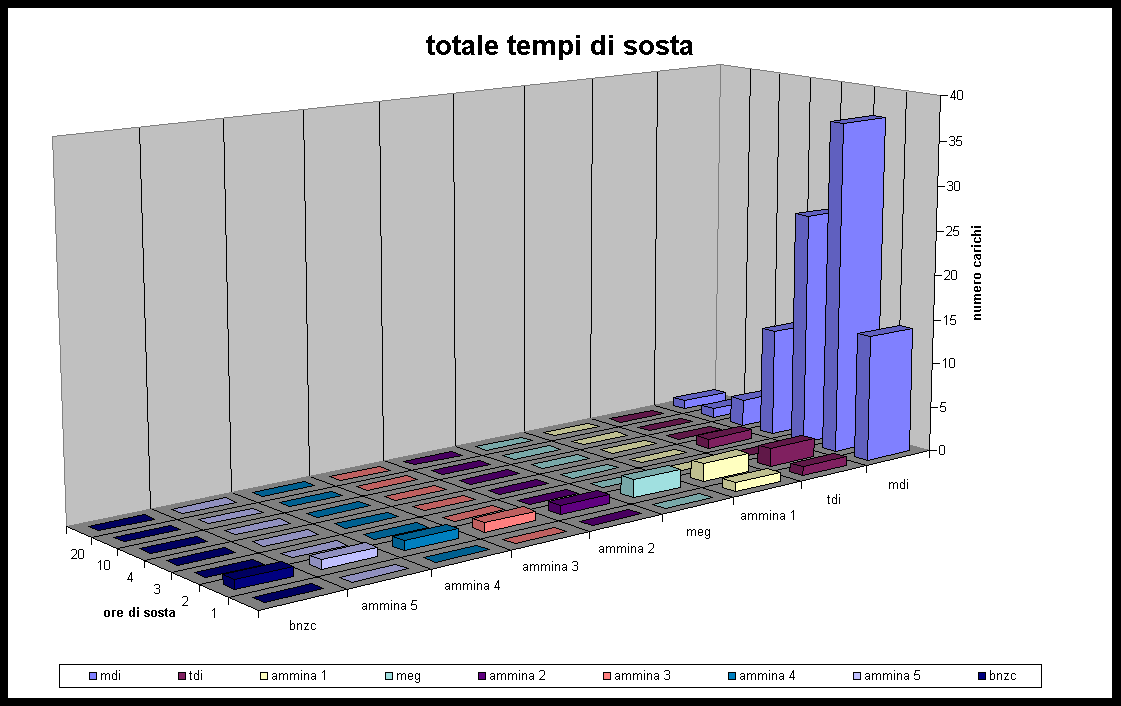 Come è possibile osservare dal grafico tutte le sostanze presentano un massimo in corrispondenza del periodo di intervallo tra 1 e 2 ore, che è un termine più che soddisfacente per l'effettuazione di tutte le procedure di controllo che vengono eseguite prima del via libera all'operazione di scarico. Solo per MDI e TDI c'è ancora una variabilità superiorie all'intervallo considerato. Ciò è da mettere in relazione all'orario di arrivo in stabilimento dei mezzi che veicolano queste materia prime e al fatto che, fuori dell'orario di lavoro, dalle 8.00 alle 18.00, non vengono più effettuate operazioni di scarico. La sosta all'esterno dello stabilimento è così forzata per gli arrivi che si prolungano oltre l'orario citato e la durata della sosta è pari al periodo che intercorre tra il momento dell'arrivo e la riapertura dello stabilimento.