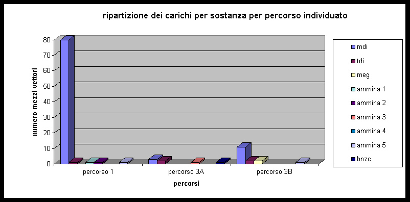 I dati elaborati sono approssimati in quanto nell'indagine non era richiesto un livello di precisione tale da poter identificare nominalmente quali tratte, per quali sostanze e relativi carichi erano interessate. Tuttavia si può sostenere che lungo il percorso 1, per la qualità delle sostanze su questo transitanti (tossiche o nocive) sia prevalente il rischio di incidente con sversamento con pericolo di esposizione a gas e vapori. Mentre sui percorsi 2 e 3 il maggior rischio è legato alla infiammabilità dei carichi e quindi alla possibilità che si inneschi un incendio.