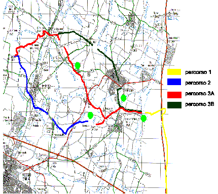 Dall'analisi delle tratte descritte nelle schede di rilevazione è emerso l'utilizzo preponderante del percorso 1. Per i restanti transiti si osserva invece una deviazione per S.Martino in Rio sulla S.P. 29 che nel percorso 3 sostituisce la S.S.468 per Budrio di Correggio: le due alternative sono quindi specificate come 3A e 3B ( per le tratte si veda lo stradario di figura 5).